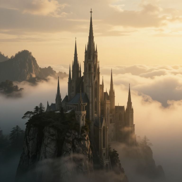 Photograph of a gothic-style, towering castle with multiple spires, silhouetted against a golden sunrise. The castle sits atop a rocky mountain, surrounded by mist that partially obscures its base. Dark evergreen trees are scattered around the castle and mountain. The sky is painted in soft hues of yellow and orange, with clouds gently illuminating the scene. The castle's intricate architecture and steep, pointed roofs are highlighted by the morning light, creating a dramatic and ethereal atmosphere. The image evokes a sense of mystery and fantasy.