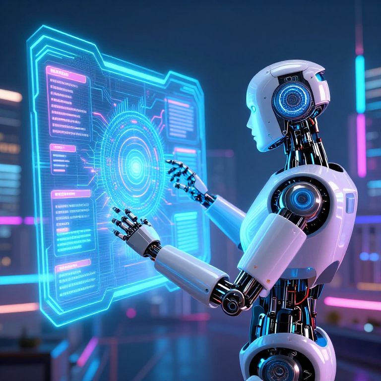 Digital CGI of a white, futuristic humanoid robot interacting with a glowing blue holographic interface in a neon-lit cityscape.