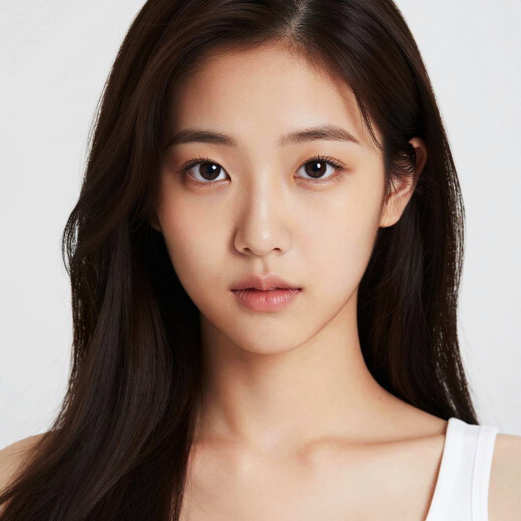 Photograph of an Asian woman with fair skin and long, straight black hair parted in the middle. She has large, almond-shaped brown eyes, thin eyebrows, and a small, straight nose. Her lips are slightly parted, revealing a neutral expression. She is wearing a white top with thin straps. The background is completely white, making her the sole focus of the image. The lighting is even, highlighting her smooth skin and natural beauty. The image has a realistic, studio-portrait style.
