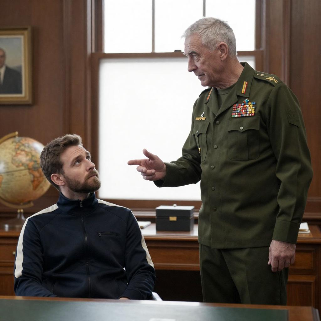 Photograph of two men in a wooden office. Elder man in green military uniform with medals, standing, gesturing with right hand. Younger man in dark tracksuit, sitting, looking up. Large window in background. Wooden desk with globe and box. Elder man has gray hair, younger man has brown hair and beard. Intense expressions.