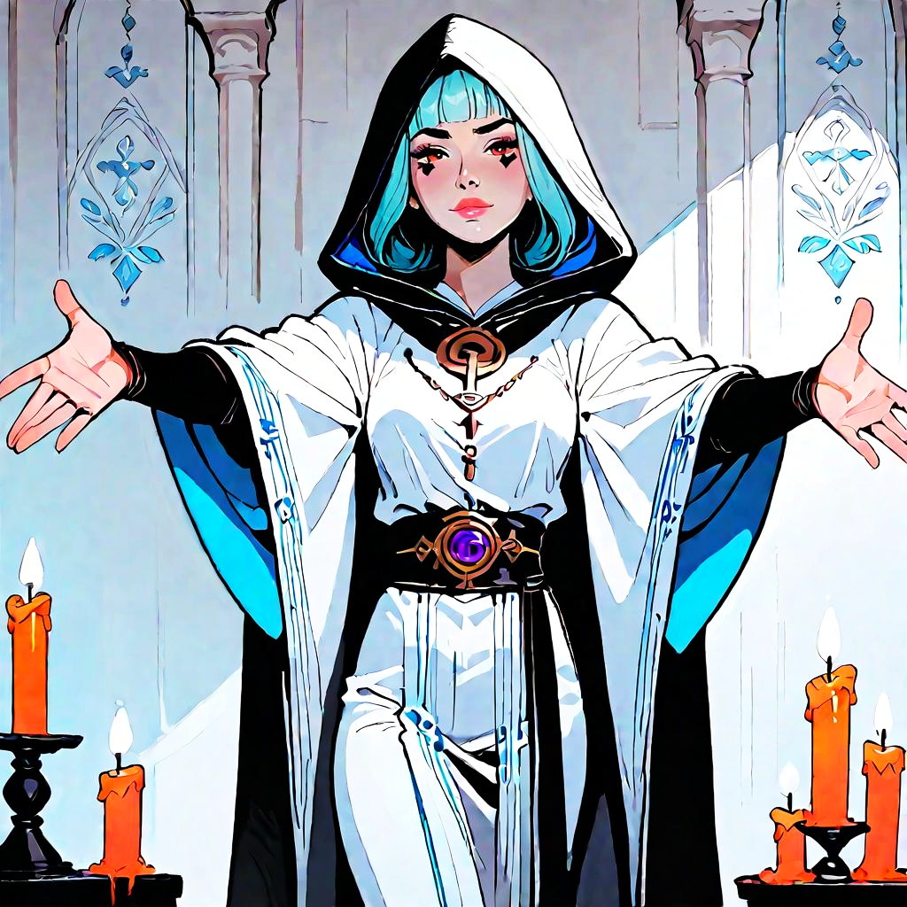 Score_9, score_8_up, score_7_up, source_anime, princessofmoonbrook, princess of moonbrook, purple eyes, purple hair, long hair, boots, bridal gauntlets, dress, hood, hood up, long sleeves, red footwear, white dress, wide sleeves, indoors, throne room, looking at viewer, dutch angle, cowboy shot