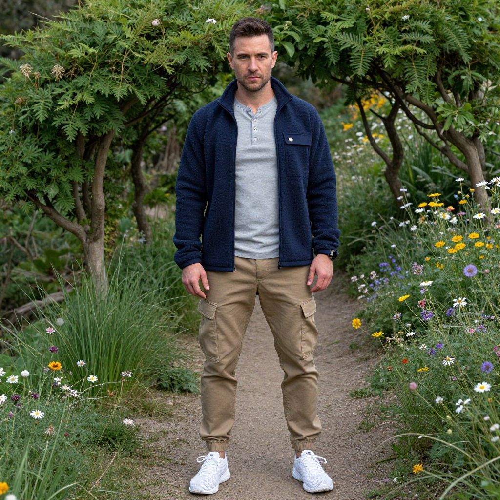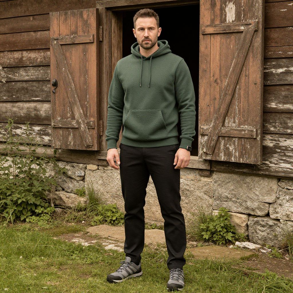 A man, fitted lightweight forest green hoodie, slim-fit black climbing pants, gray trail runners, historic meeting house, weathered wooden shutters, lush green courtyard, sepia effect, relaxed expression. Man has masculine face and piercing eyes