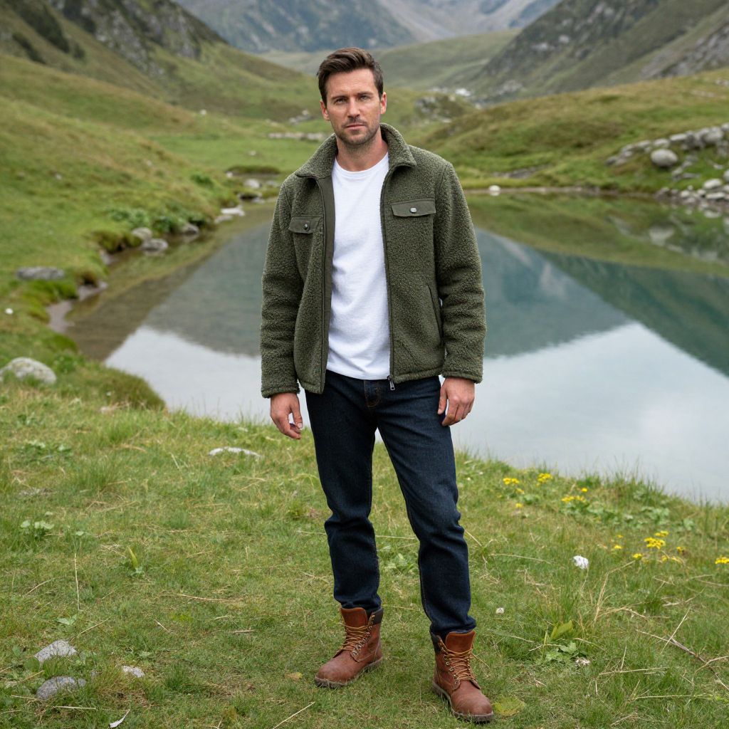 Photograph of a tall, handsome Caucasian man with short dark brown hair and a trimmed beard, standing in front of a rustic, weathered wooden shed with peeling paint and open, aged wooden shutters. He is wearing a dark green hooded sweatshirt, black pants, and grey sneakers. His hands are relaxed by his sides. The shed's wooden texture contrasts with the lush green grass and small plants in the foreground. The man's serious expression and casual attire suggest a relaxed, rural setting. The image has a slight overexposure effect, enhancing the rustic charm.
