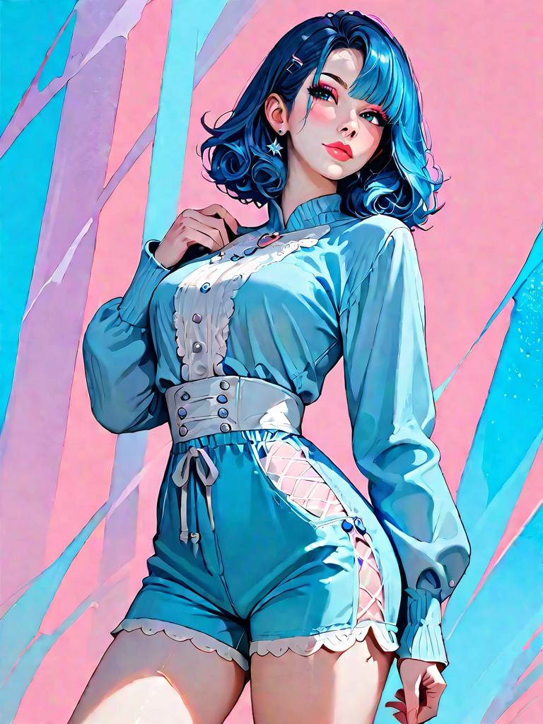 1girl, realistic face, Velvet romper, midnight blue, long sleeves, deep V-back, fitted silhouette, scalloped lace edges, elastic waistband, flared shorts, luxurious texture, matching lace boyshorts, soft and plush feel.