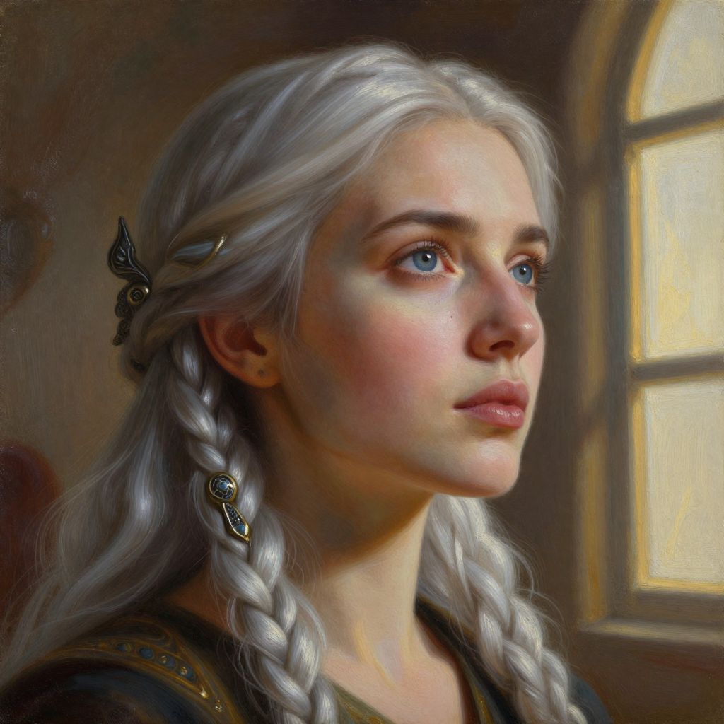 A portrait photograph showcases a Middle Eastern woman's enigmatic countenance, her piercing blue eyes and porcelain skin illuminated by soft golden light from an adjacent window. Viewed from an unusual low angle, emphasizing strong jawline and delicate cheekbones, this hyperrealistic digital oil painting captures intricate details of silver hair adorned with ancient Viking-inspired braids. As she gazes pensively into the distance, her expression conveys a nuanced blend of resilience and introspection, inviting viewers on a journey through time to explore the captivating tapestry of stories woven within her visage.