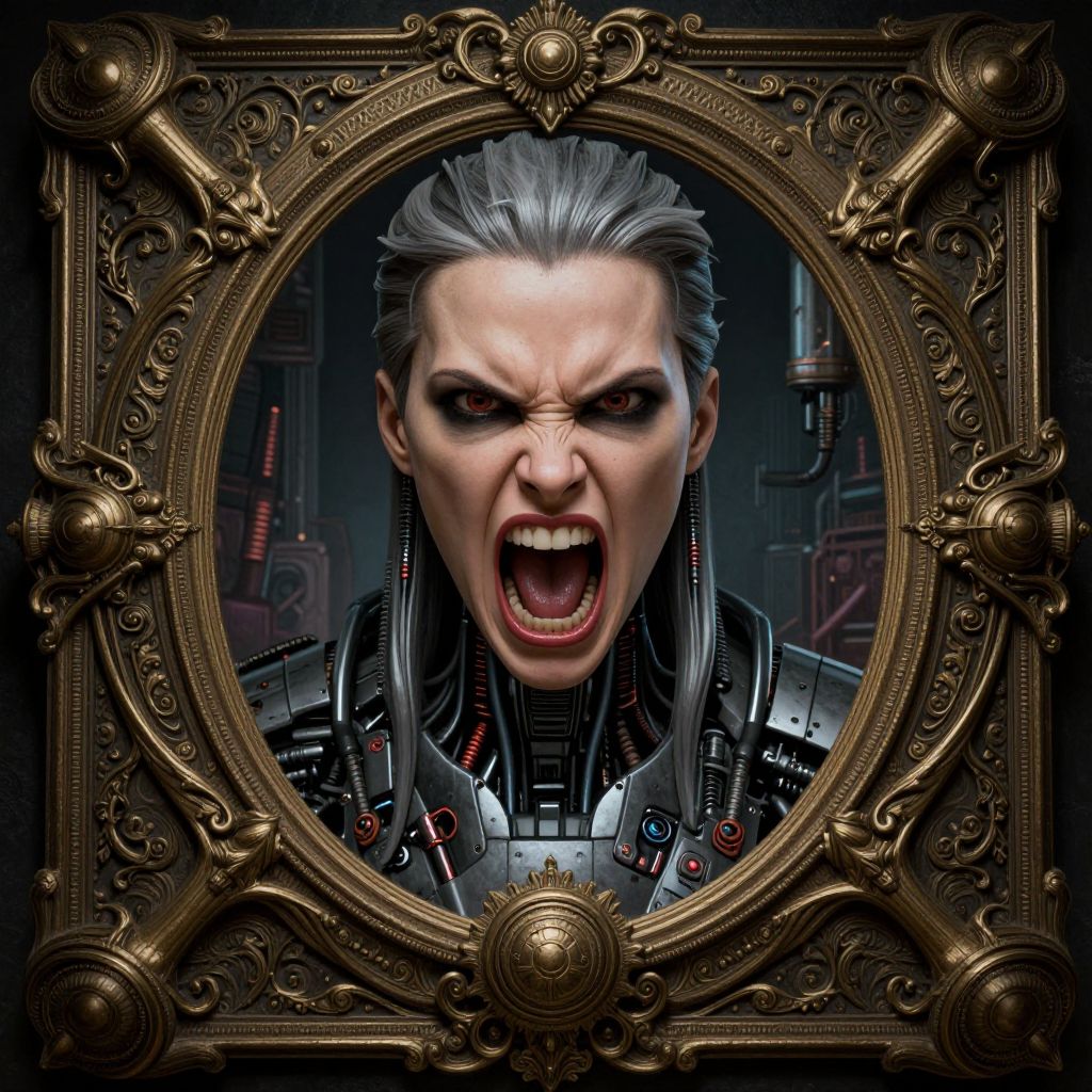 Angry robot woman screaming, by syd mead and wlop, matte painting, spooky, detailed, photo realism, realism, intricate, ornate, cyberpunk, future, symmetry, technology