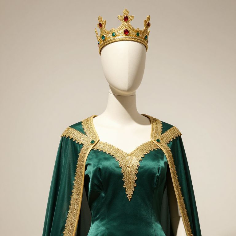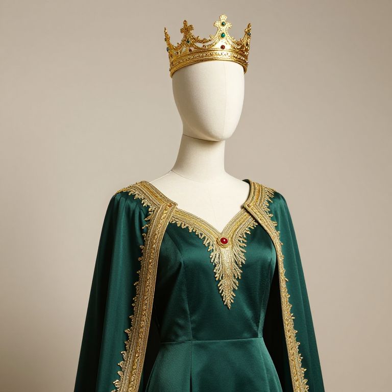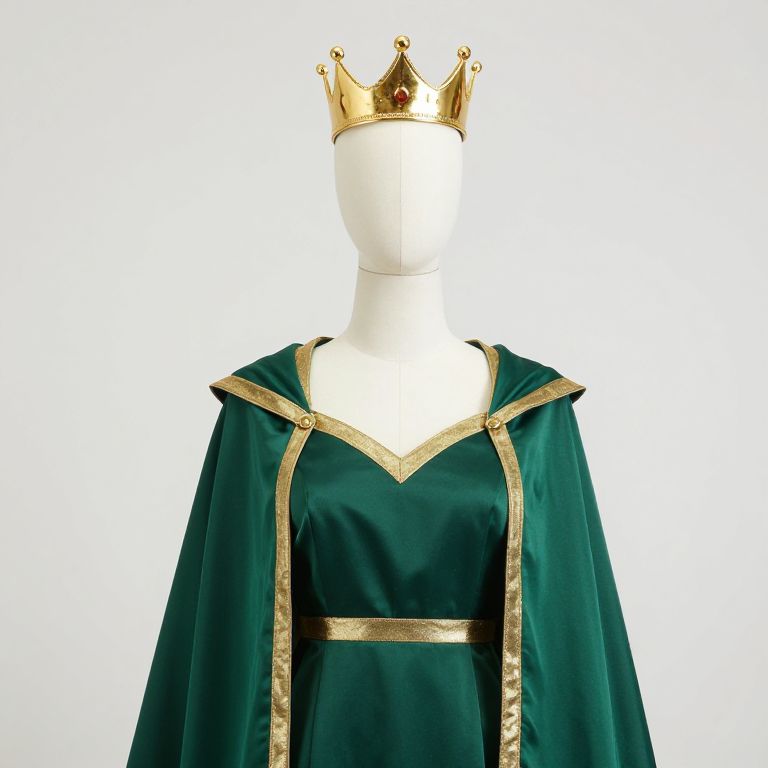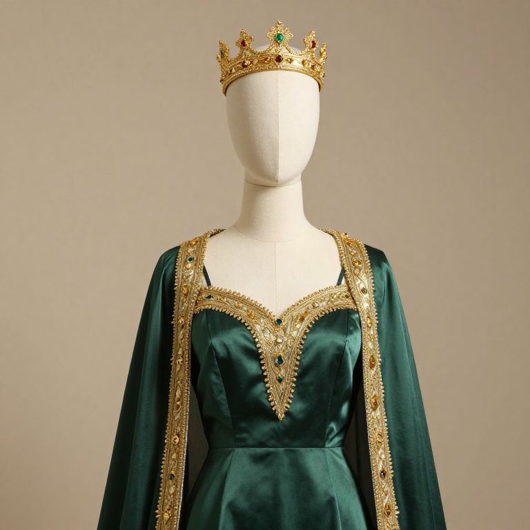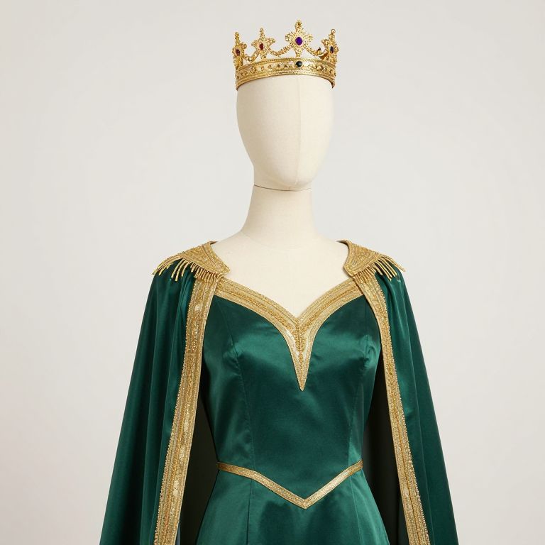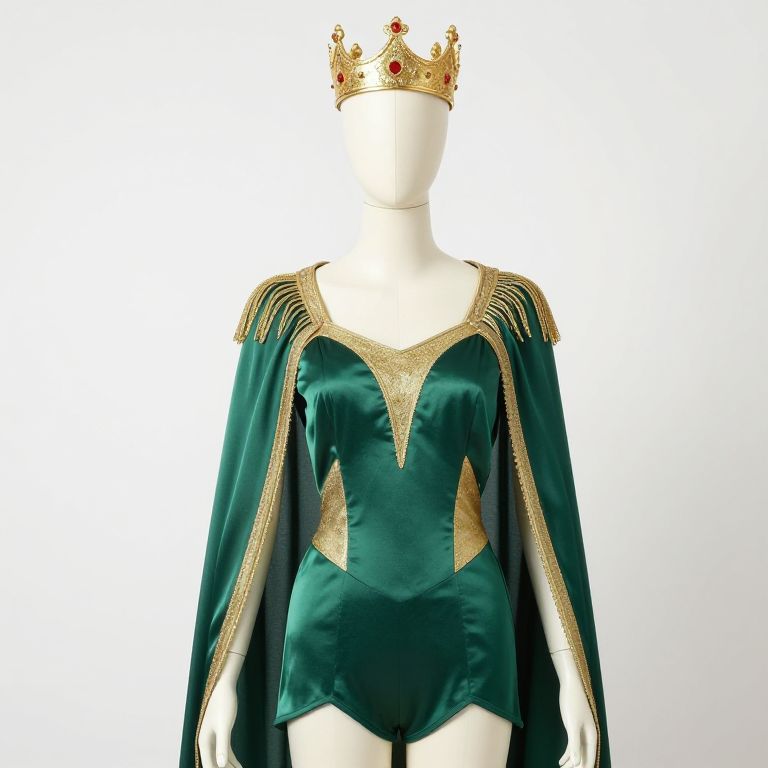 Photograph of a faceless white mannequin wearing a dark green velvet bodysuit with gold accents and long, flowing sleeves. The bodysuit features a V-shaped gold pattern on the chest and gold epaulettes on the shoulders. The mannequin also wears a gold crown adorned with red jewels, positioned centrally on its head. The background is plain white, highlighting the rich textures and colors of the outfit. The image focuses on the regal, royal-inspired costume, emphasizing the luxurious velvet and ornate gold details.