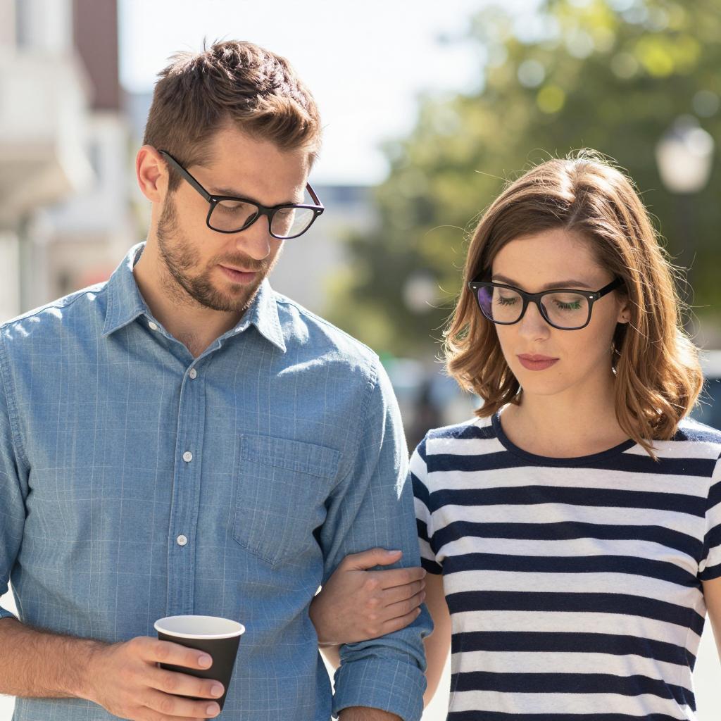 Two people and a dog. Man with glasses, grey suit, holding black phone, left side. Golden retriever sitting, white fur, center. Woman with curly red hair, black phone, wicker baby carriage with blanket, right side. White border with ured edges.