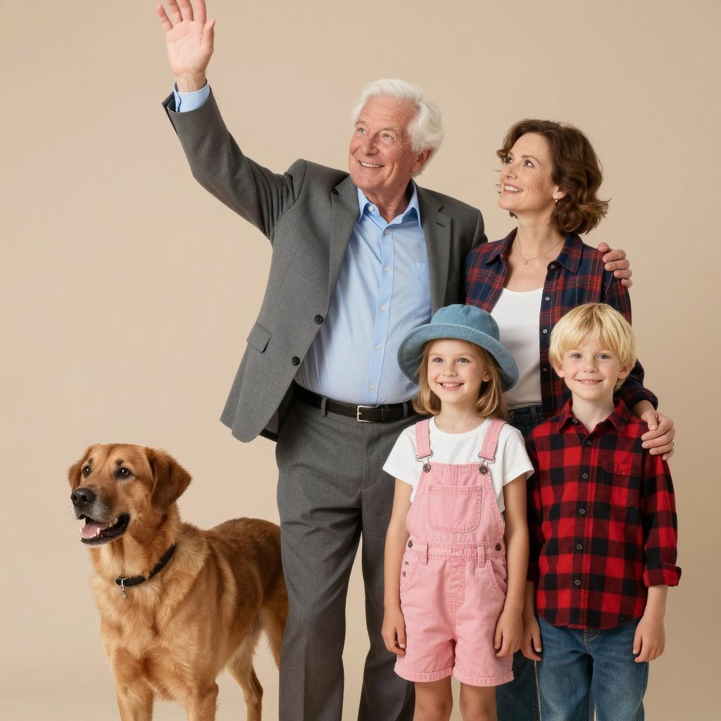 A man wearing a grey suit and glasses stands on the left holding a black smartphone. A golden retriever with white fur sits happily in the center. A woman with curly red hair, dressed in a white blouse and beige skirt, is on the right side holding a black smartphone and pushing a wicker baby carriage with a blanket inside. The background is white with a soft white border and red edges.
