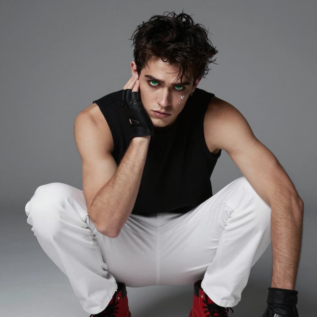 Male with pale skin and dark hair, wearing a black suit and white shirt, has intense red, jagged makeup on his face. Background is dark and plain. His eyes are wide open, and he has a neutral expression. Blood stains are visible on his shirt collar.
