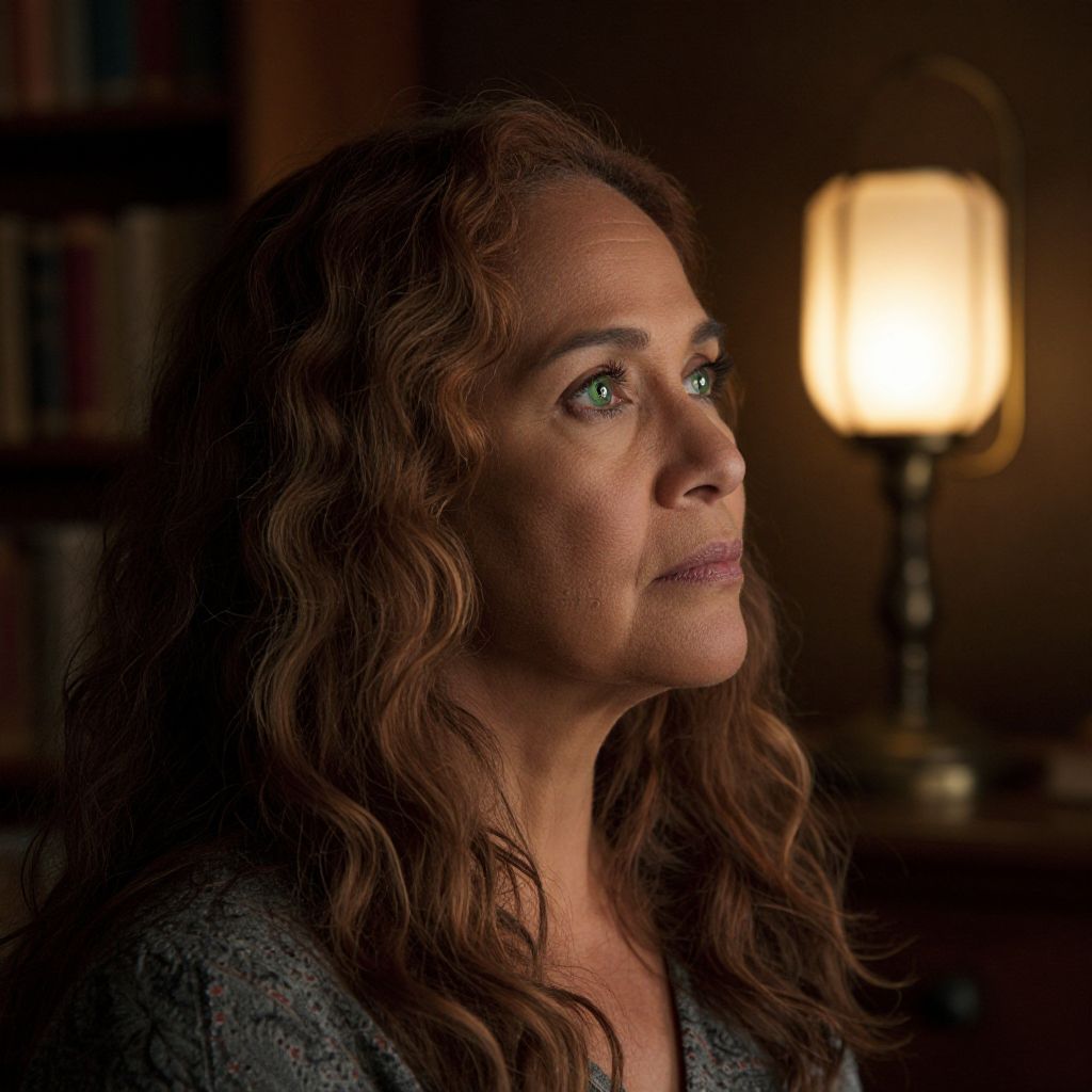 Create an introspective portrait of a middle-aged Polynesian woman with wavy chestnut hair and piercing green eyes, set amidst the ambiance of a dimly lit rustic library. The soft glow from an antique reading lamp illuminates her thoughtful expression, reflecting the inner turmoil she faces in grappling with life's complexities. Capture this emotional moment from an unconventional angle, showcasing her profile against the interplay of soft shadows and subtle lines on her face—a testament to wisdom and resilience etched upon her skin. This evocative portrait aims to evoke empathy and connection, inviting viewers to delve into her world as she navigates between past memories and future dreams.