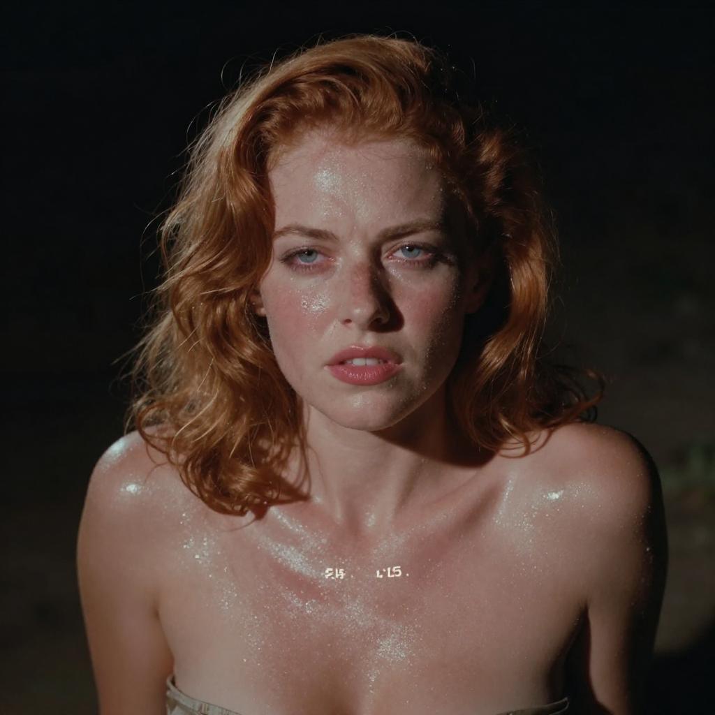 Night female relaxed backlit (Deep Focus) contrast (f_stop 2.8), (focal_length 35.0) f/2.8, 35mm focal length Photograph of (view from above:1.42), analog photo, silhouette, spotlight, upper body view showing her face and (gigantic cleavage:1.15), a beautiful busty european woman, pale skin, highly detailed face, ultra detailed oiled sweaty dirty skin, dirty natural red hair, blue piercing eyes, eyes squinted, (lustful facial expression, lusty, lascivious:1.3), 1950s, dark background, warm colors, RAW candid cinema, 16mm, color graded portra 400 film, remarkable color, ultra realistic, captured on a (Fujifilm X-Pro3) / (f_stop 16.0), (focal_length 24.0)