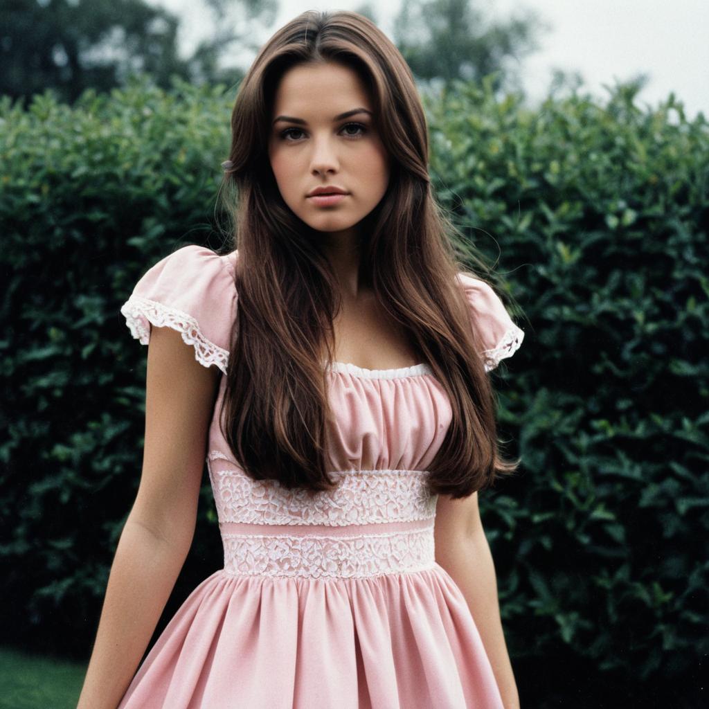 Portrait of a young woman with long brown hair wearing a multicolored striped dress standing on green grass next to a large tree in an outdoor park setting. The woman is looking directly at the viewer with a neutral expression. The dress features short sleeves and lace trim at the neckline and hem.