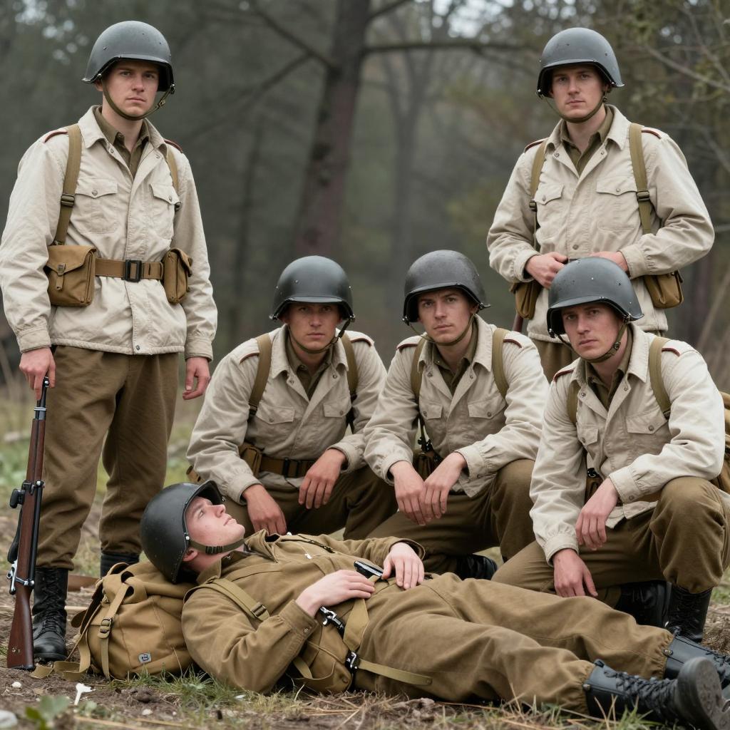 Three male soldiers in World War II uniforms. Each wears a helmet, holds a rifle. First soldier on left smiles, second soldier in center has neutral expression, third soldier on right squints. Visible patches and buttons on uniforms. Soldiers stand closely together. Background is plain.