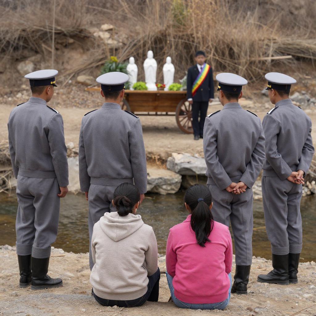 Photograph of a group of six people in an outdoor, rocky setting near a small stream. Four men in gray naval uniforms with caps stand with backs to the camera, two women in casual clothes sit and stand, one in bright pink. A wooden cart with white statues and greenery is in the background. One man in a dark suit with colorful sash stands near the cart. Dry, brown landscape with sparse vegetation. The men's backs are to the camera, faces not visible. The woman in pink has a noticeable bright color.