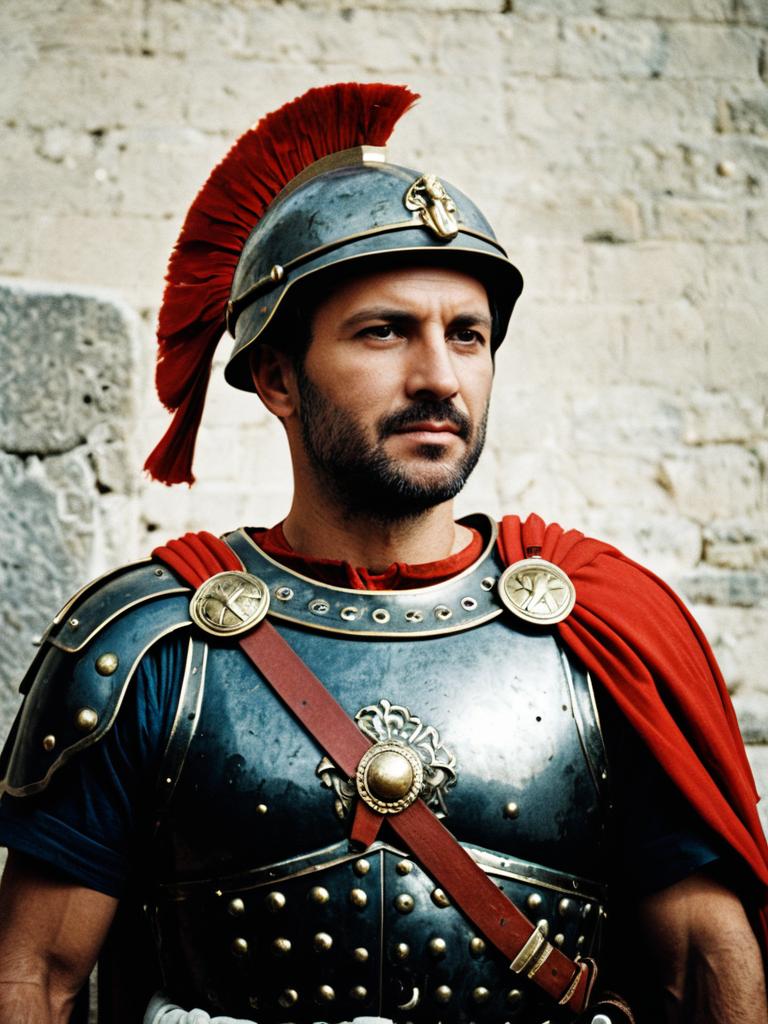 Photorealistic waist-up portrait of a man dressed as a Roman soldier, wearing a detailed metal cuirass with brass rivets, shoulder armor, and a red tunic. The subject has dark hair, a trimmed beard, and a serious expression, standing against a textured stone wall background.
