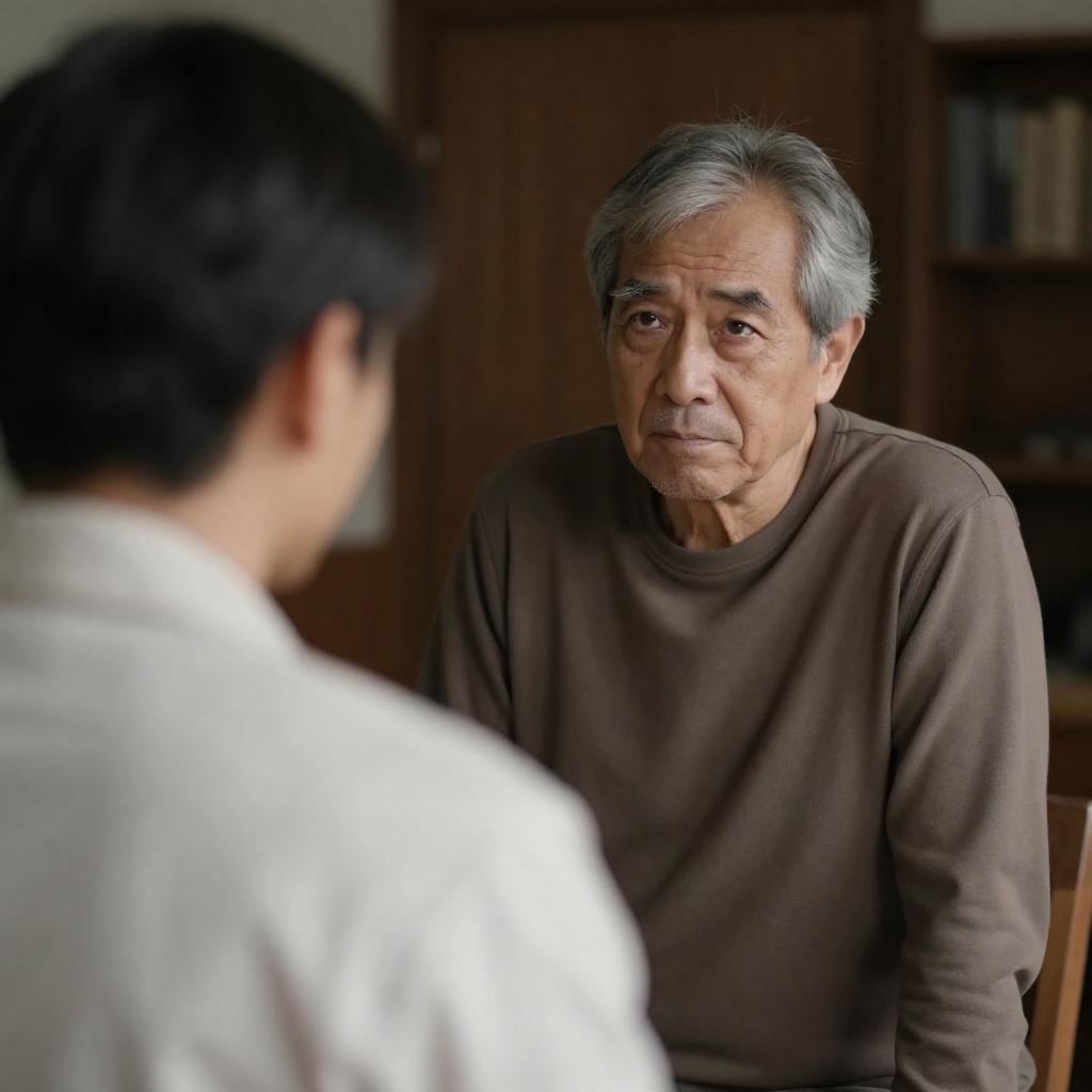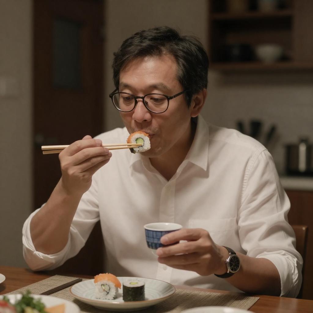 Photograph of an older Asian man with glasses and a green sweater, and a younger Asian man with short black hair and a blue shirt, sitting at a wooden table eating dinner. Plates, a can, and a pinecone are on the table. The older man uses chopsticks, while the younger man holds a glass of red wine. Dimly lit room with traditional Japanese sliding doors in the background.