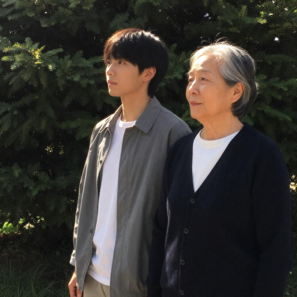 Photograph of two people standing outdoors in a sunlit garden. A younger person with short dark hair, wearing a gray jacket over a white shirt, stands slightly behind an older person with gray hair, wearing a black cardigan over a white shirt. Both look to the right. Dense green foliage forms the background.