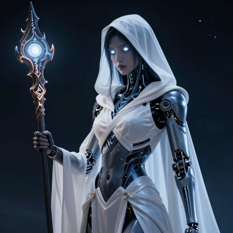 This digital CGI image depicts a futuristic, cybernetic female figure with glowing white eyes, standing against a dark, starry background. She wears a flowing white hooded cloak over a form-fitting, metallic, black-and-silver bodysuit that reveals her cybernetic limbs and torso. Her right hand holds a ornate staff with a glowing blue orb at its top. The cloak's fabric appears smooth and translucent, contrasting with the sleek, shiny texture of her cybernetic armor. She has a slender, athletic build with small to medium-sized breasts. The overall style combines elements of science fiction and fantasy, with a dark, mystical atmosphere enhanced by the glowing blue light from the orb.