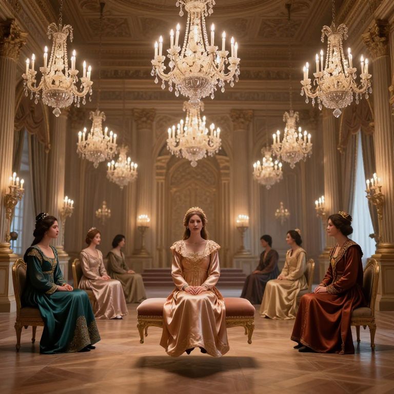Gravity has reversed in a palace where footstools hover above silk-robed nobles, and chandeliers rain soft candlelight that never touches the floor.
