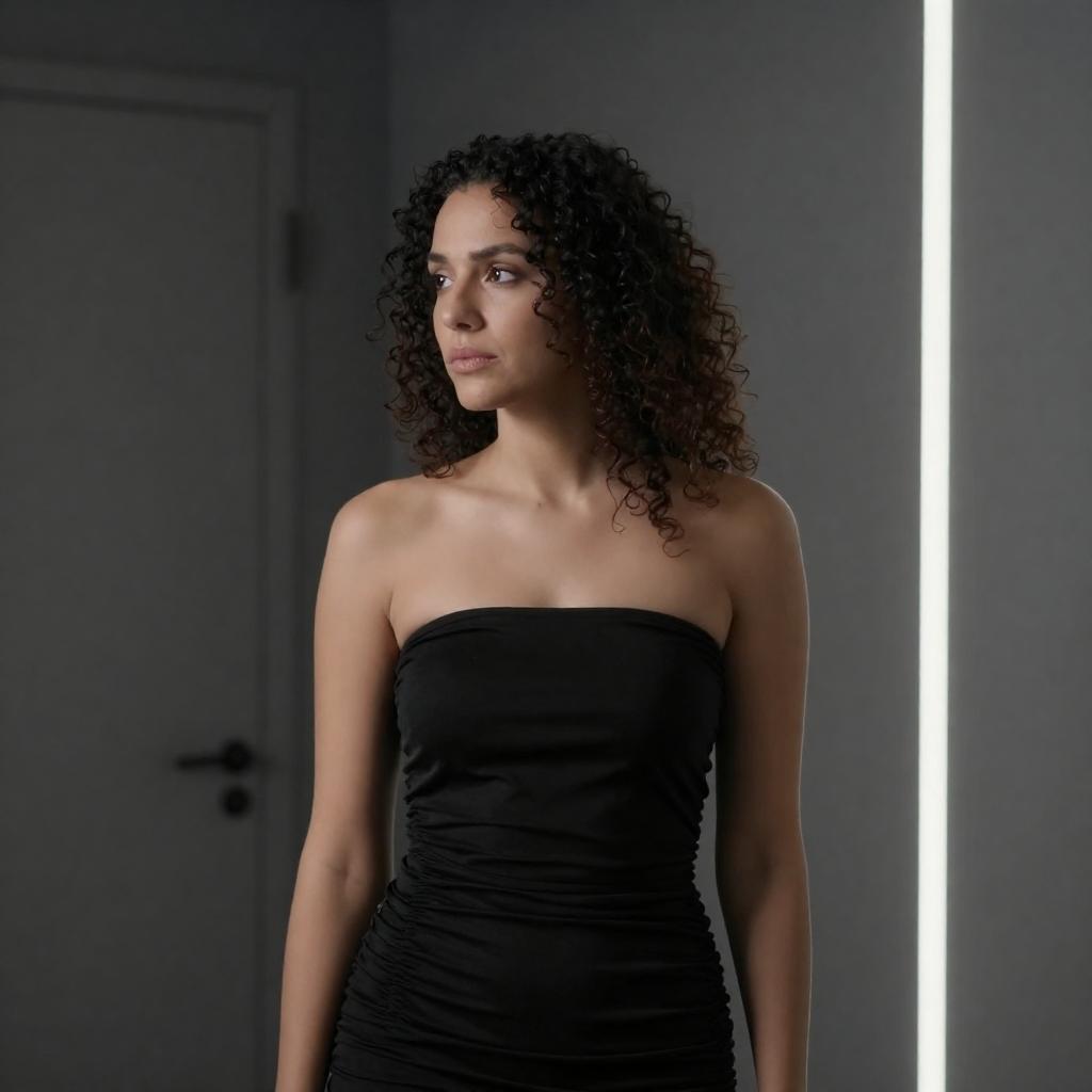 Photograph of a woman with curly dark hair, wearing a strapless, black, ruched dress, standing in a dimly lit room with gray walls and a vertical light strip on the right. She gazes to the left, her expression thoughtful. The background includes a closed door on the left.