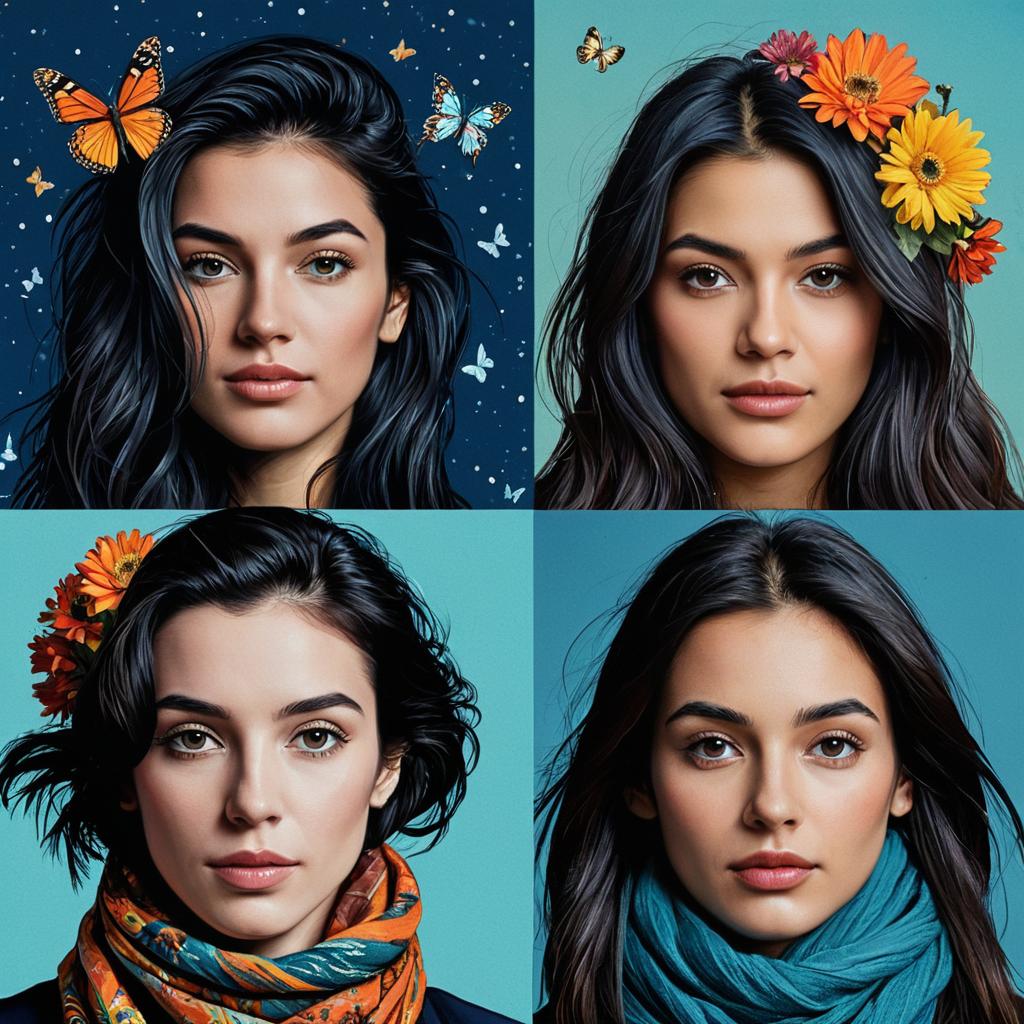 Collage of four stylized portraits of women featuring expressive eyes and vibrant colors. Each portrait showcases unique artistic elements such as dark hair adorned with flowers, butterflies around the head, colorful headscarves, and soft painterly shading. The backgrounds include soft blue and night sky themes, complementing warm skin tones and cool blue and teal accents. The women have smooth complexions and natural makeup, highlighting detailed facial features and varied hairstyles.