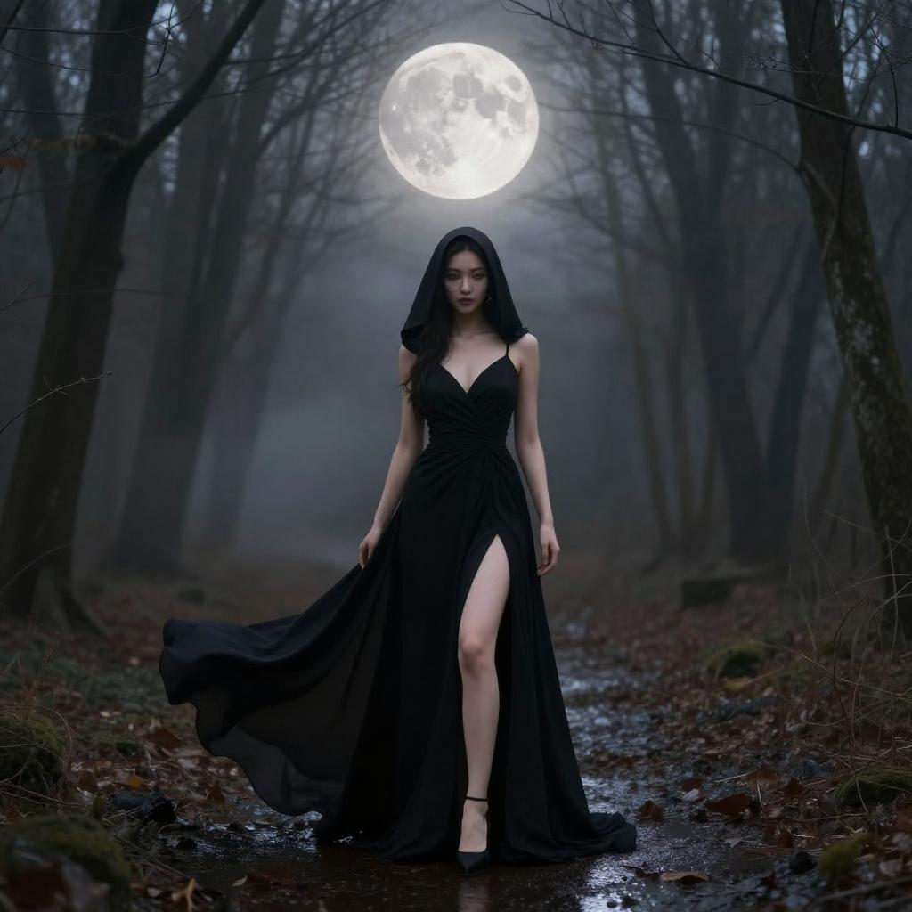 Portrait of a mysterious gothic sorceress standing in a shadowy forest, adorned with long flowing velvet gown and ornate silver jewelry. She has pale skin, long wavy black hair, and piercing dark eyes with dramatic makeup. The sorceress wears a detailed crown and holds a flickering candle, creating an ethereal glow in the diffused forest light. Her captivating presence is enhanced by the dark, mystical ambiance surrounding her.
