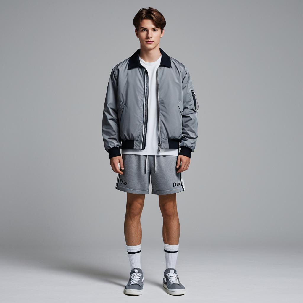 Full-body portrait of a young man with brown hair wearing a grey bomber jacket, white t-shirt, grey Dior shorts, white socks with black stripes, and grey Dior sneakers. The subject stands against a simple grey background, facing the camera with a neutral expression.