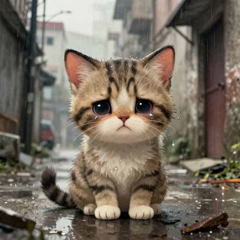 Digital illustration of a small tabby kitten with large, tear-filled eyes sitting on a wet ground in an abandoned urban alley. The kitten's fur is damp with rain droplets, emphasizing its emotional expression. The background features a gritty city alley with muted colors and subtle light rays piercing through the cloudy sky, creating a heartfelt and melancholic atmosphere. Realistic textures combined with a watercolor effect enhance the emotional impact of the scene.