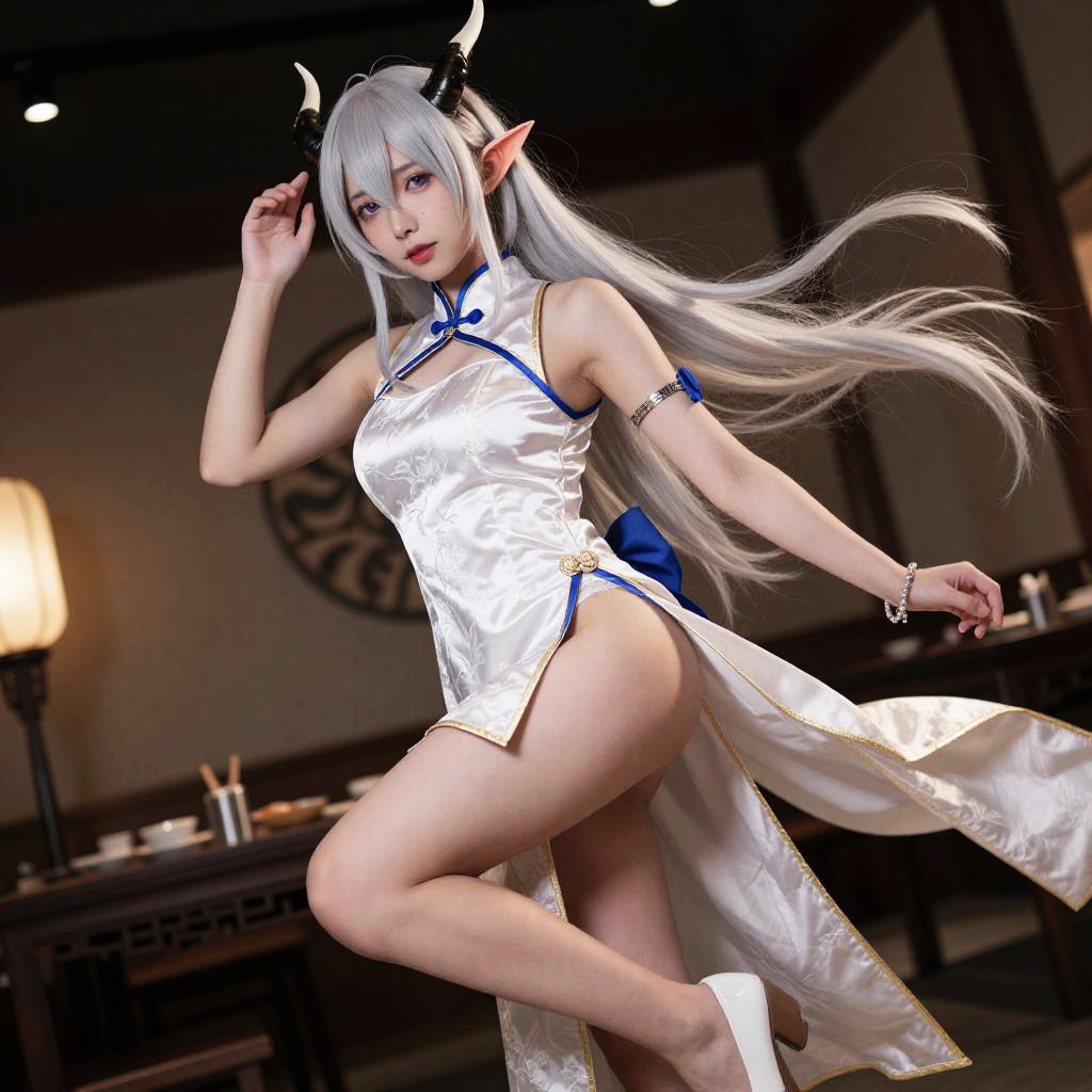 This is a digital CGI image of a young, anime-style woman with long, silver-white hair, wearing a white, form-fitting, sleeveless qipao with blue trim and a high slit, revealing her right thigh. She has black, horn-like headpieces and pointed elf ears. Her skin is fair, and she has red lips and blue eyes. She is posed in a dynamic, mid-leap stance, with her right hand raised and left leg bent. She wears white high heels and a blue armband. The background is a dimly lit, traditional Japanese-style room with a wooden table, lamp, and clock on the wall.