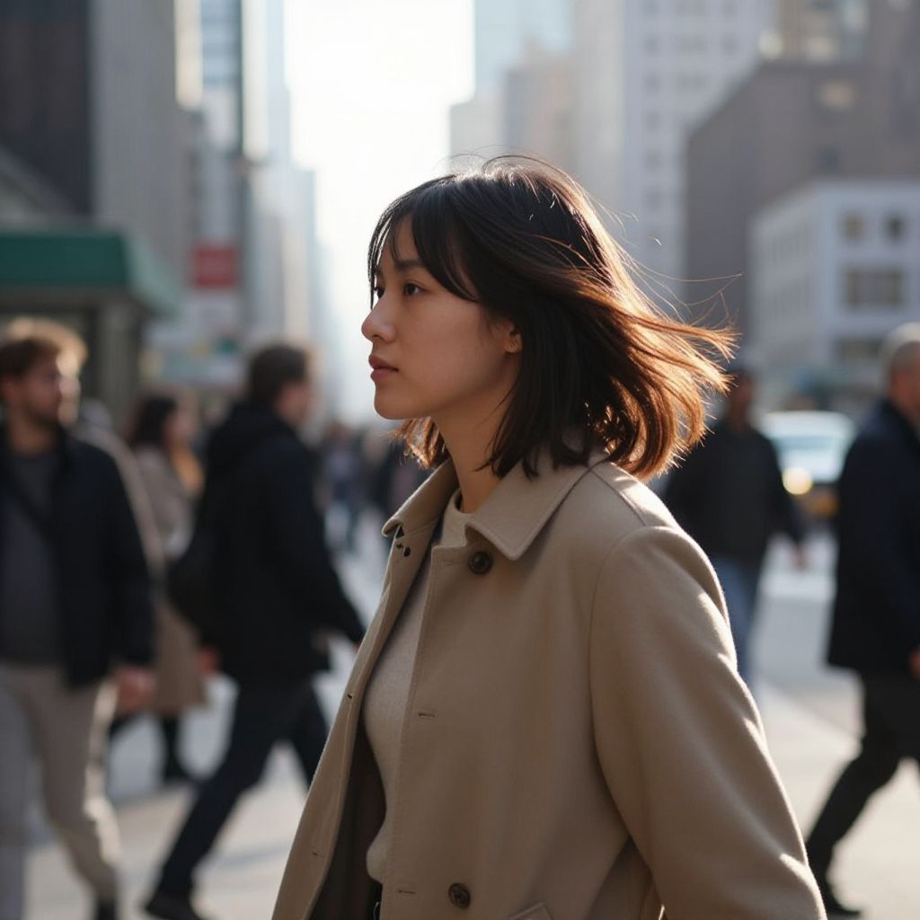 Woman with undercut with soft layers hairstyle walking through a vintage city street, retro signage, warm afternoon light, flowing hair in contrast to structured cut, urban charm, detailed facial features, rich textures, cinematic depth, MidJourney aesthetic.
