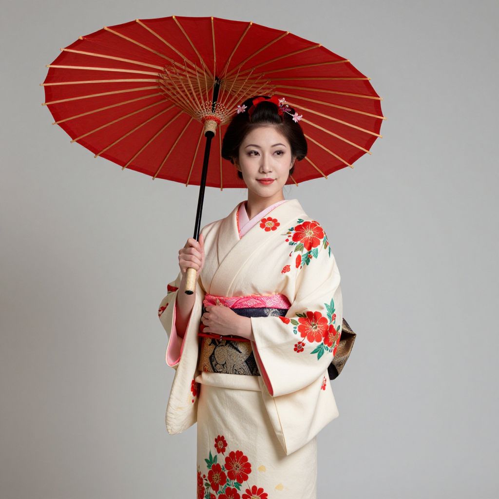 Woman dressed in a cream-colored kimono adorned with vibrant red floral embroidery stands gracefully, holding a large red parasol with intricate wooden ribs above her head, creating a striking contrast against the neutral background.