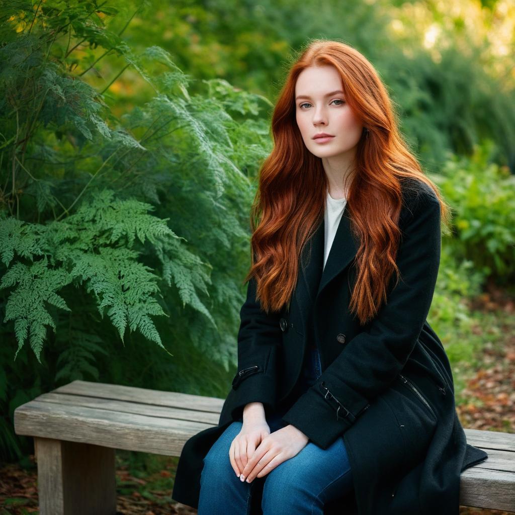 A moody portrait of a young woman with long red hair and pale skin, wearing a gray sweater, standing in front of lush green tropical leaves, soft natural lighting, cool tone color scheme with emphasis on green and muted brown colors, detailed facial features, calm expression