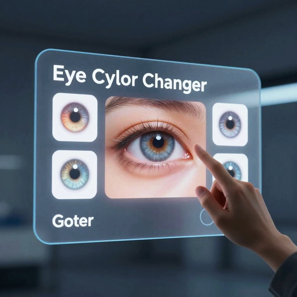 Eye color changer visualized as a sleek futuristic app interface projected on a transparent screen, user selecting various iris colors from a palette, realistic eye underneath showing smooth color transitions, modern tech vibe with soft blue ambient lighting.