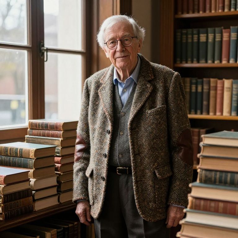 Professor tweed jacket worn by an elderly academic in a vintage library, surrounded by stacks of old books and warm sunlight filtering through tall windows, detailed textures of worn wool and leather elbow patches, cozy intellectual atmosphere.