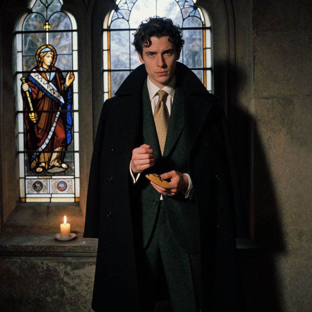 A man, dark green wool suit, cream dress shirt, textured silk tie, tailored black overcoat, tan suede derby shoes, Gothic arches, stained glass windows, flickering candlelight, anscochrome analog film, contemplative expression Man has masculine face and piercing eyes