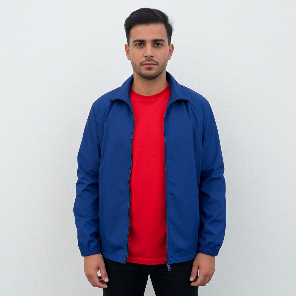 "Trendy Wear, man in a red shirt and blue jacket standing in front of a wall"