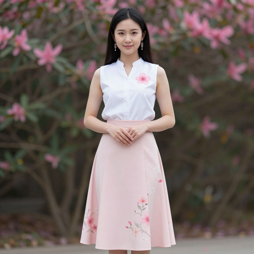 Photograph of an East Asian woman standing outdoors against a blurred background of pink flowers and green foliage. She has long, straight black hair, fair skin, and wears a sleeveless white blouse with delicate pink floral embroidery on the chest and a high-waisted, A-line pink skirt adorned with similar floral patterns. She is smiling subtly, with hands gently clasped in front of her. She wears dangling silver earrings. The image has a soft, natural light, enhancing the pink hues of the flowers and her skirt, creating a serene, spring-like atmosphere.