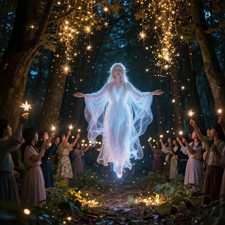 Photograph of a glowing, ethereal woman in flowing white dress, surrounded by sparkling lights, floating above a forest clearing with onlookers holding spark