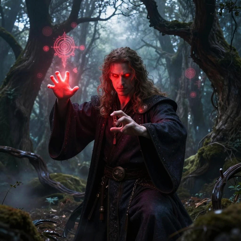 Rykard, enigmatic mage with glowing crimson eyes, casting a powerful spell in a mystical forest filled with twisted trees and floating arcane symbols, atmospheric fog and dramatic lighting highlighting his intense expression.