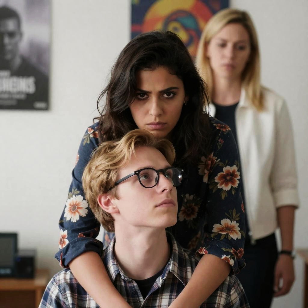 Photograph of three people in an indoor setting. Foreground: young man with blonde hair, glasses, plaid shirt, looking up; woman with dark hair, floral shirt, hiding behind him, intense expression; background: blonde woman in white jacket, looking down. Wall posters and artwork in background.