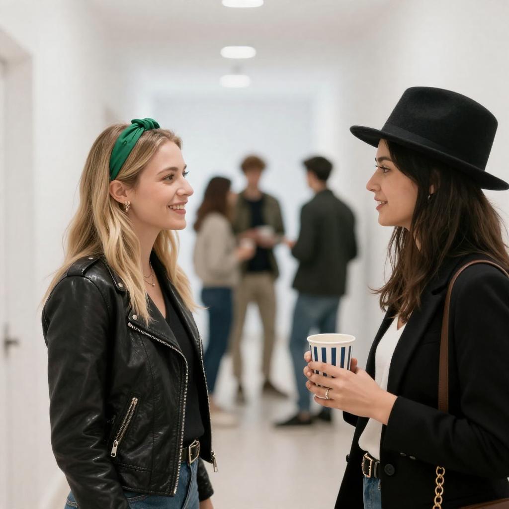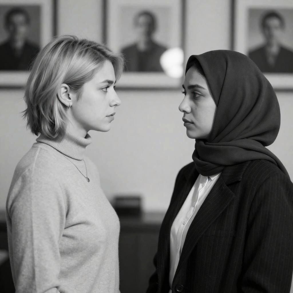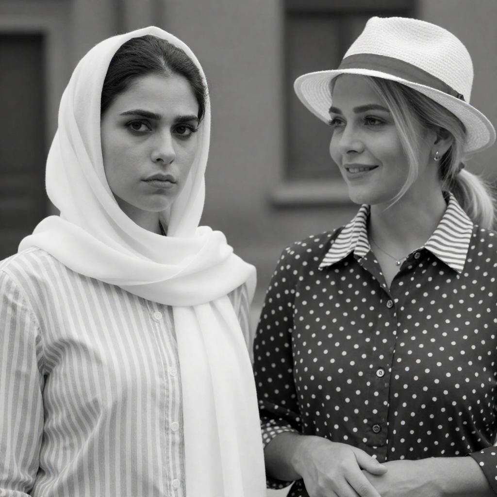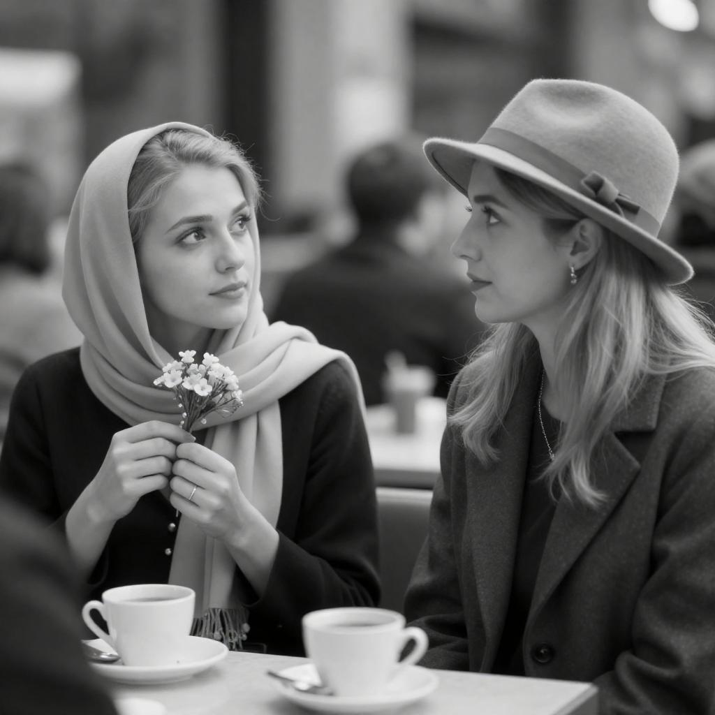 Black and white photograph of two women sitting at a restaurant table. Both women have light skin, blonde hair, and are wearing hats. The woman on the left has a headscarf and is holding a small bouquet, looking up. The woman on the right wears a light-colored hat and a dark coat, looking at the other woman. They have cups and saucers on the table. Background is blurry with indistinct people and objects. Both women have relaxed, attentive expressions.