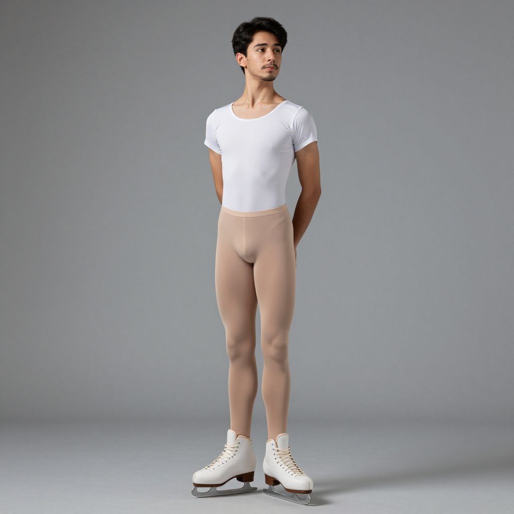 Photograph of a young, slender man with short dark hair, wearing a white t-shirt, beige tights, and white ice skates, standing