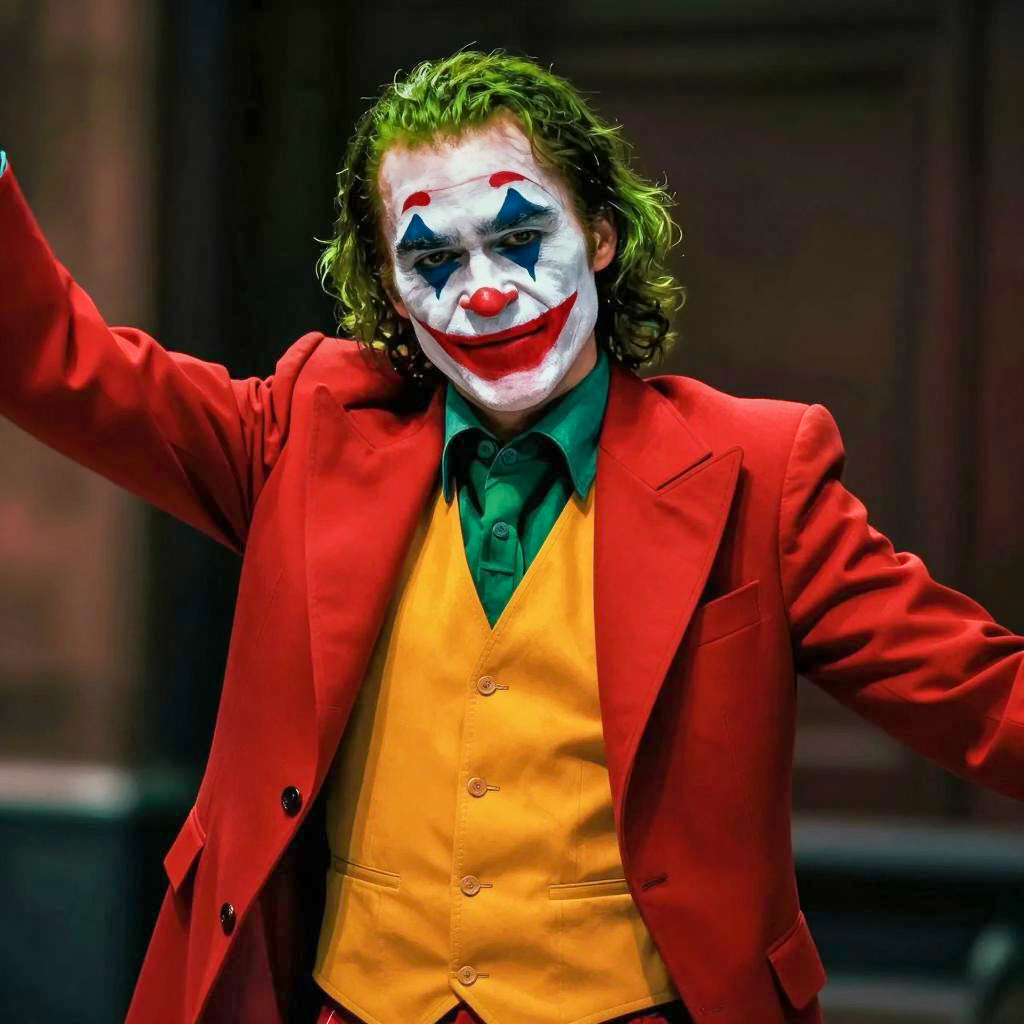Man in Joker costume points gun forward. White face paint, green shirt, purple jacket, green tie with dots, purple gloves. Black hair slicked back, red lipstick, wide grin. Background: staircase, lamp, curtains. Indoor setting. Man centered, arm extended.