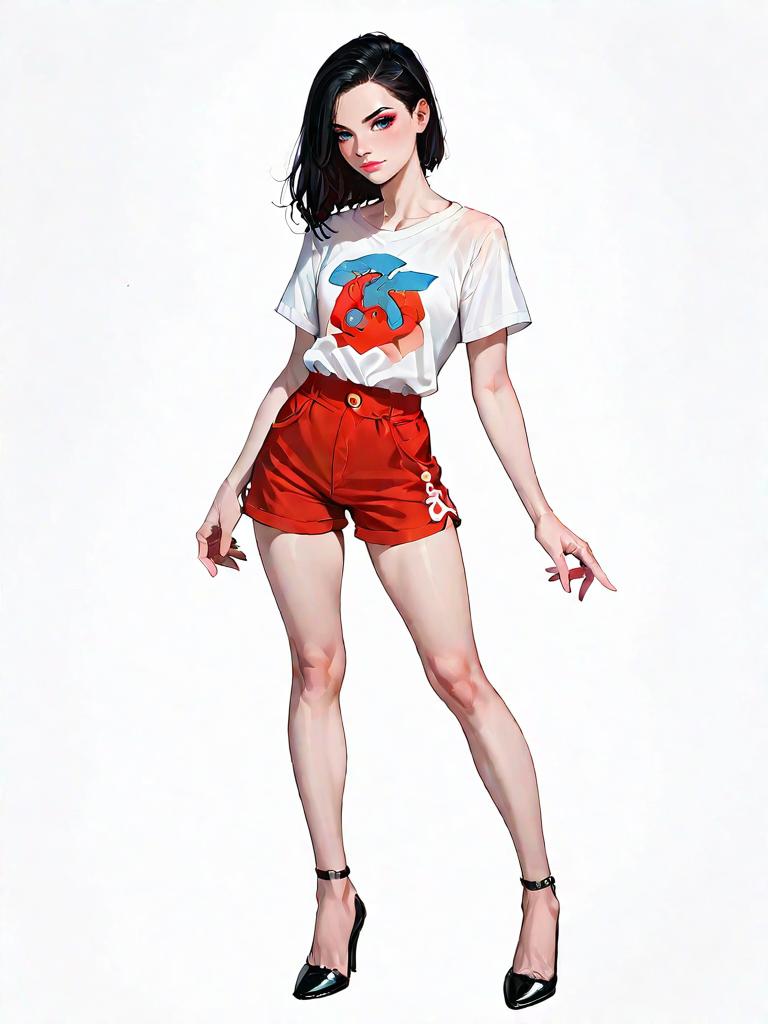 1girl, source_comics, realistic face, full body shot, Woman, casual streetwear, coral red cropped t-shirt, frayed denim shorts, mid-thigh length, white sneakers, white baseball cap with logo, relaxed posture, plain white studio background.