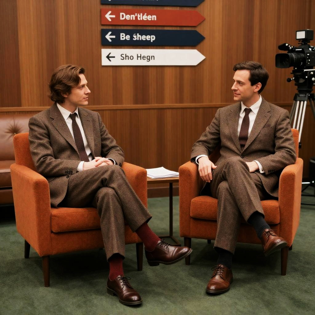 Photograph of a vintage scene from "The Ed Sullivan Show" featuring six men in suits and ties. The central figure, a young man with dark hair in a black suit, sits while an older man with gray hair and glasses stands, holding a cane. The background includes other men in green vests and bow ties, all looking at the central figure. The setting is a dimly lit studio with a stage-like atmosphere.