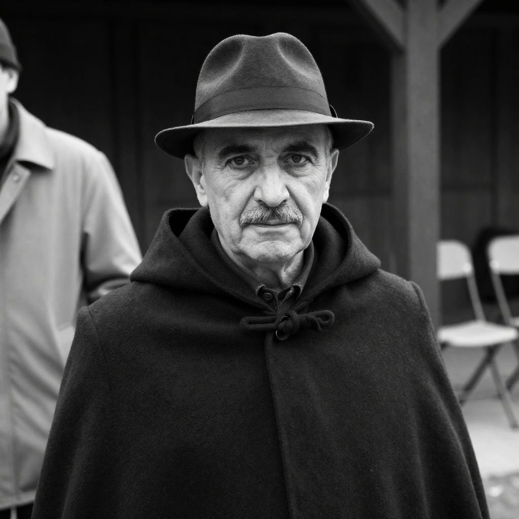 Black-and-white photograph. Older man with a mustache, wearing a dark cloak and fedora, intense gaze. Partially visible person in light coat, left background. Wooden structure, outdoor setting, several empty folding chairs. Dim light, shadows.