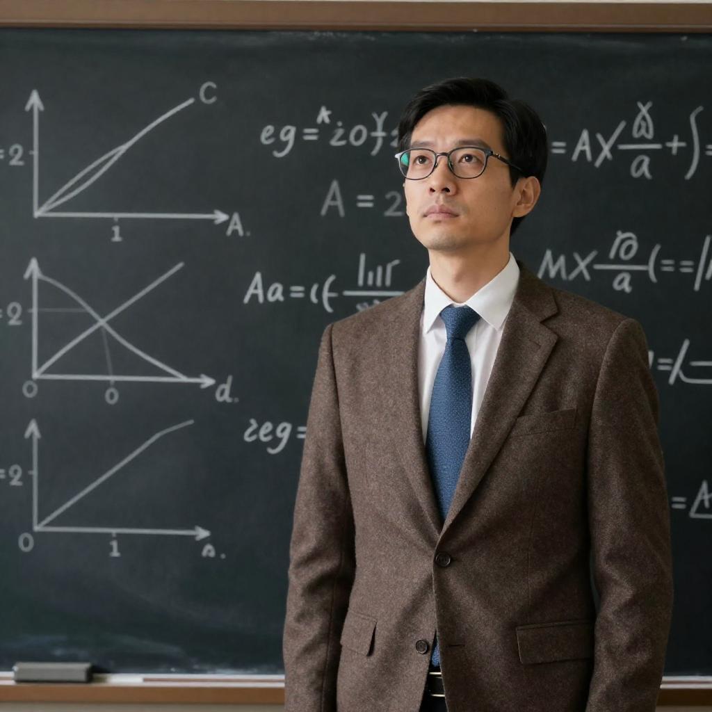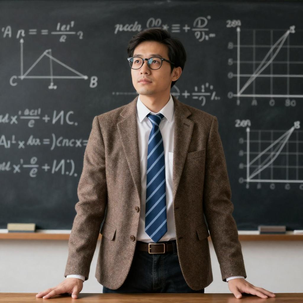 Middle-aged man with short black hair, medium build, wearing green shirt and brown pants, standing in classroom. Chalkboards with mathematical equations and diagrams in background. Hands clasped in front, slightly smiling. Watch on left wrist. Desk and chair on left.