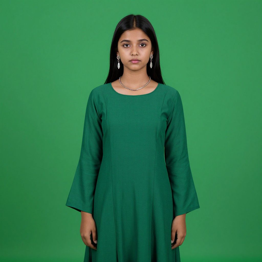 Photograph of a young woman with medium brown skin and straight black hair, standing against a solid green background. She wears a long, dark green, loose-fitting tunic with three-quarter length sleeves and a simple round neckline. She accessorizes with silver hoop earrings and a thin necklace. Her expression is neutral, and she stands with her arms slightly away from her body. The green background is evenly lit, creating a uniform color that contrasts with her dark tunic. The image has a clean, professional look with no additional objects or distractions.