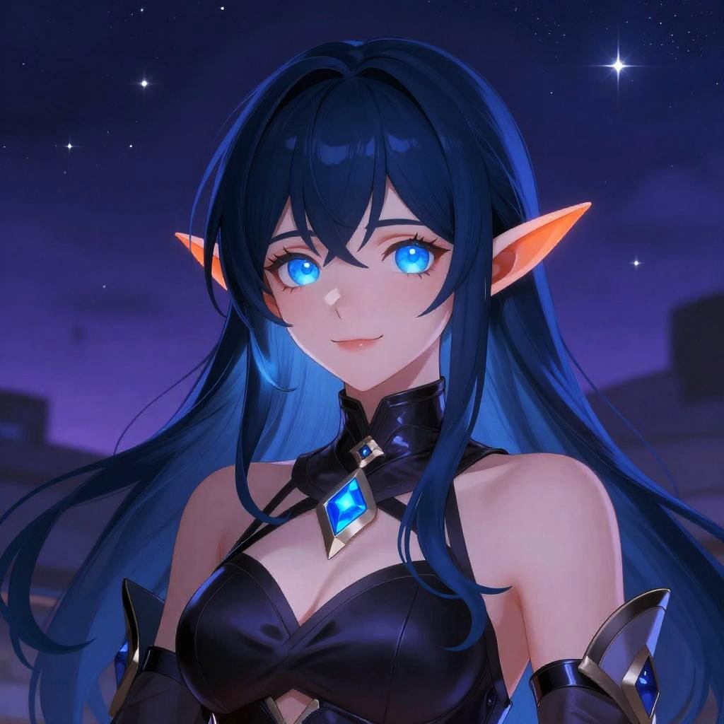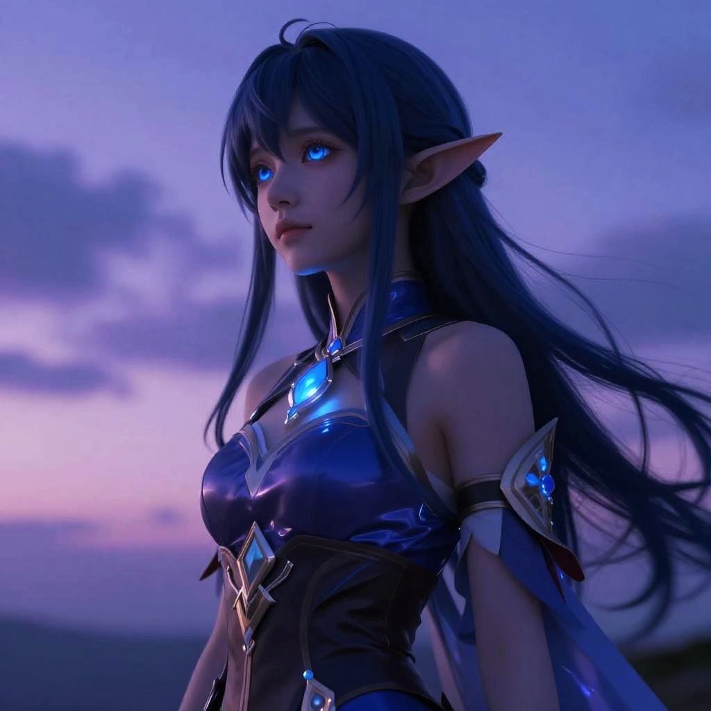 Portrait of a fantasy elf girl with long dark blue hair and glowing blue eyes, wearing a shiny dark outfit with a glowing pendant, standing under a twilight sky with soft purple clouds, ethereal and magical atmosphere, anime style, soft lighting and smooth shading
